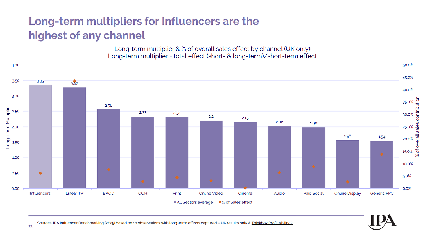 The IPA has published a meta-analysis of influencer campaign results based on MMM across different countries. The full report can be read here. Note that even though the IPA is based in the UK, this analysis includes a mix of 220 cases across a variety of countries.