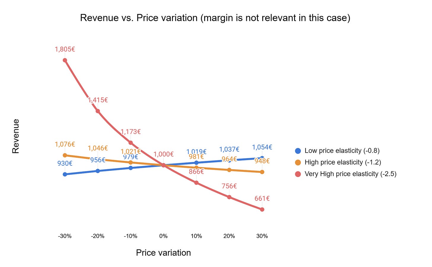 Side note: price elasticity is as complex metric from a mathematical standpoint, it’s not as simple as it looks like from the conceptual POV. For example, it should not be confused with the derivative of the revenue vs. pricing graph! For the calculations of this newsletter we used the "midpoint elasticity" formulas. Other definitions like the “Point elasticity” are even tricker in math treatment, as they are not even symmetrical.