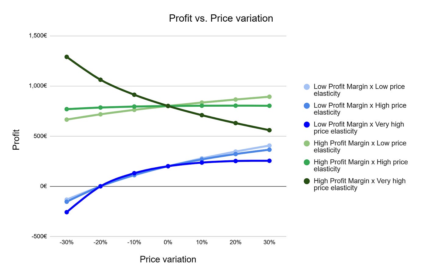 On high margin scenarios (green) the different price elasticities can shape the outcome. Around an elasticity of -1 there's more to gain or lose, it's a "flatish" line. That's true for elasticities around abs(-1.2 to -1.5). If elasciticy is higher than abs(-2), then increasing prices at high margins is not a good idea.