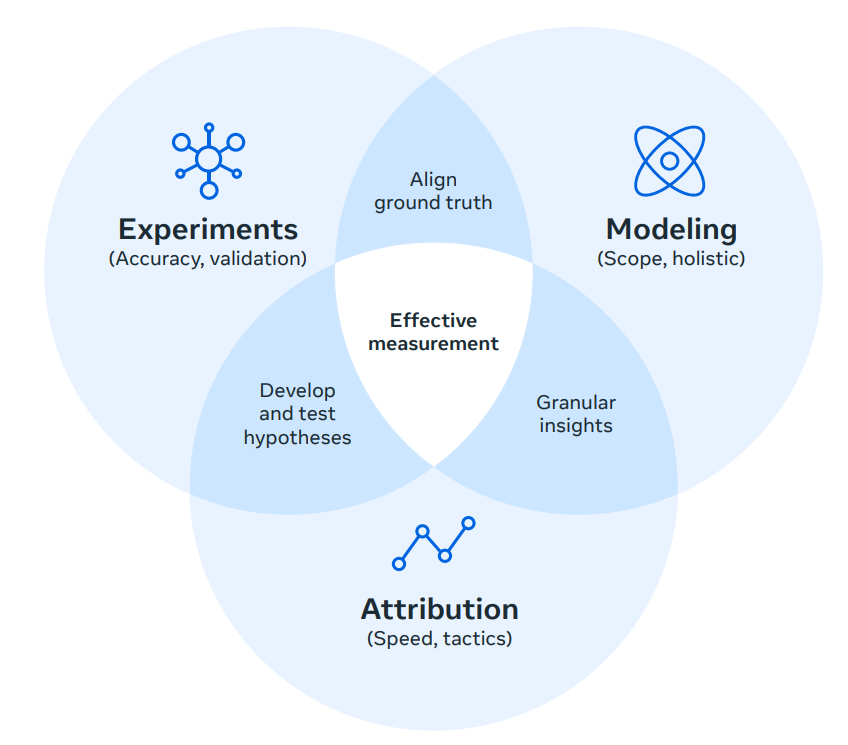 In 2019, Google published its "Three Grand Challenges" document that set the foundation of today's accepted view that good measurement combines Marketing Mix Models (MMM), experiments, and attribution. From these developments to the more recent branding of “Modern Measurement,” the visual depictions are usually some kind of variation of these triangular and now “multi-bubble” charts.