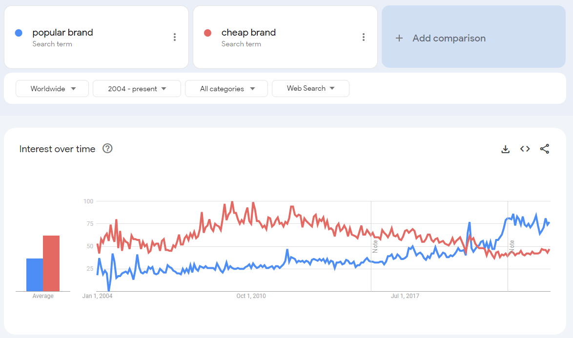 The searches of “popular brand” have recently overtaken the ones of “cheap brand”. Interesting to see 2008-2012 hump of “cheap brand” during the global crisis and its later steady decline.