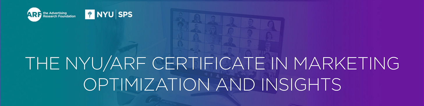 The NYU/ARF “Certificate in Marketing Optimization and Insights” is open for enrolment in December for the cohort to start on January 2024. Click for more details.