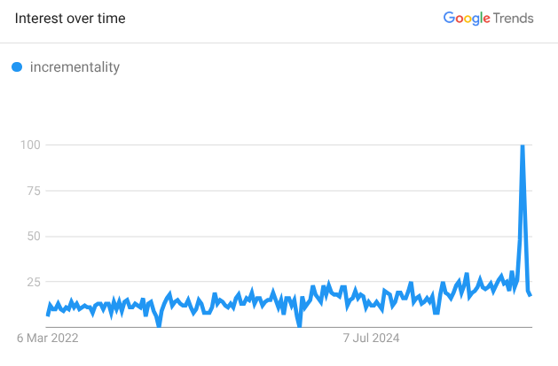 Incrementality is the latest new word in the trade (link). The average search volume has roughly doubled in the last year with some really big punctual spikes driven.